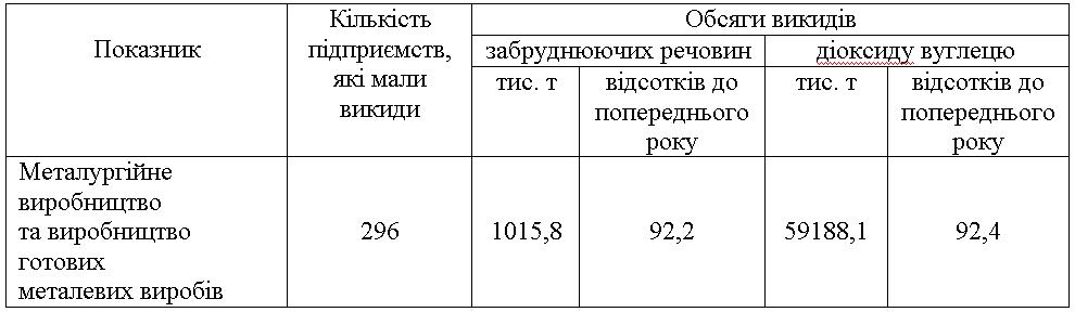 Таблиця. Викиди забруднюючих речовин та діоксиду вуглецю в атмосферне повітря підприємствами металургійної промисловості у 2012 році