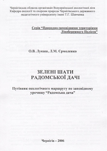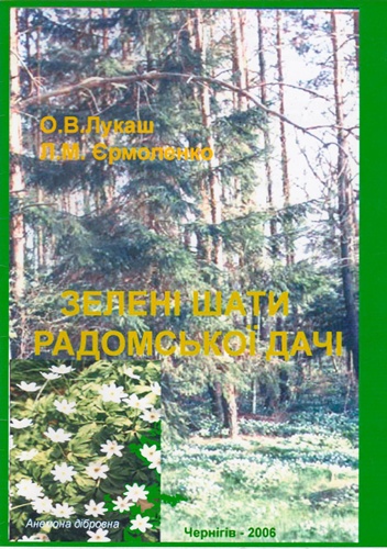 9. Лукаш О. В., Єрмоленко Л. М. Зелені шати Радомської дачі. Путівник екологічного маршруту по заповідному урочищу «Радомська дача». – Чернігів, 2006. – 12 с.