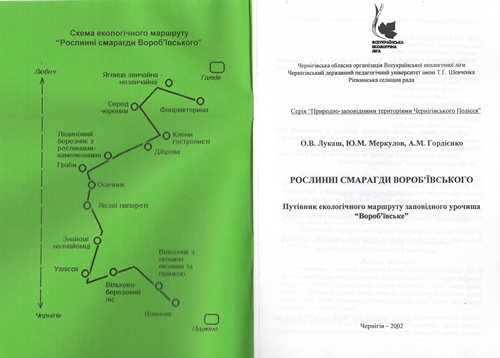 3. Лукаш О. В., Меркулов Ю. М., Гордієнко А. М. Рослинні смарагди Вороб’ївського. Путівник екологічного маршруту заповідного урочища «Вороб’ївське». – Чернігів, 2002. – 21 с.