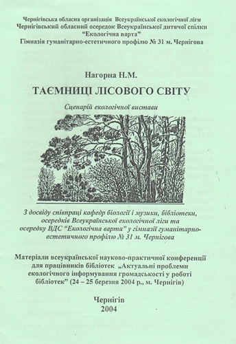 7. Нагорна Н. М. Таємниці лісового світу. Сценарій екологічної вистави / Матеріали всеукраїнської науково-практичної конференції для працівників бібліотек «Актуальні проблеми екологічного інформування громадськості у роботі бібліотек» (24–25 березня 2004 р., м. Чернігів). – Чернігів, 2004. – 14 с.