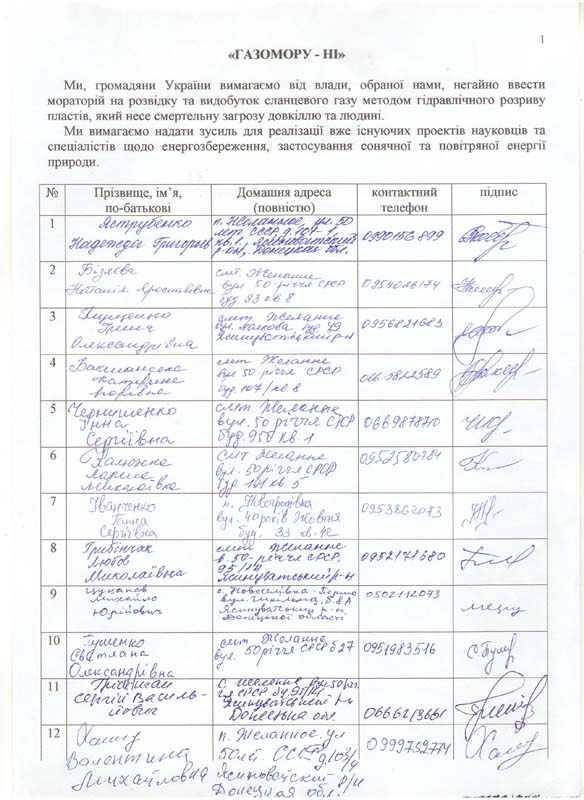 Пропонуємо Вашій увазі зразок підписного листа для участі у Всеукраїнській національній кампанії «Ні – сланцевому газу в України!».