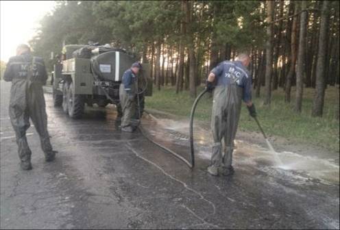 neytralizaciaРоботи зі знезаражування забрудненої території проводилася Роменським центром рятувальних робіт підвищеного ризику Міжрегіонального центру швидкого  реагування ДСНС України. Внаслідок дегазації було вивезено приблизно 100 т відпрацьованого сорбенту, зокрема у перший день – 830 мішків (~ 41,5 т), у другий  – 400 мішків (~ 20 т).